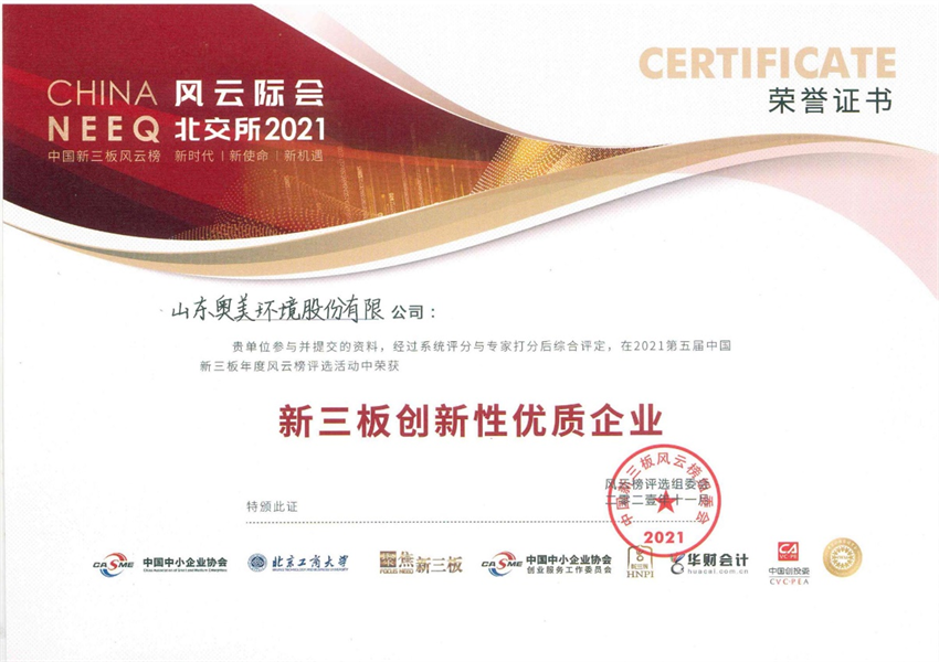 公司在2021年第五屆中國新三板年度風(fēng)云榜評選活動(dòng)中,經(jīng)過(guò)系統評分和組委會(huì )專(zhuān)家打分后綜合評定后,榮獲新三板創(chuàng )新性?xún)?yōu)質(zhì)企業(yè)。