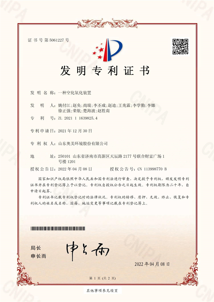日前,公司又獲得一項發(fā)明專(zhuān)利證書(shū),名稱(chēng)為“一種空化氧化裝置”,專(zhuān)利號為ZL2021116398254。